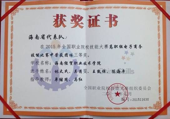 7月4日讯(电子商务专业报道)2015年全国职业院校技能大赛高职组电子商务技能赛项在天津市举行,共有来自全国的77支代表队参加,由公司信息技术系电子商务专业员工王凯顺、吴清旻、林太氏、陈海平四位同学组成的海南省代表队荣获团体三等奖。